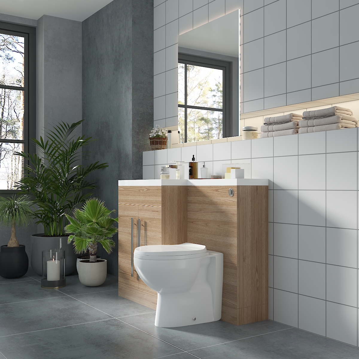 Calm Light Oak Left Hand Combination Vanity Unit Basin L Shape with Back to Wall Splash Toilet & Soft Close Seat & Concealed Cistern - 1100mm