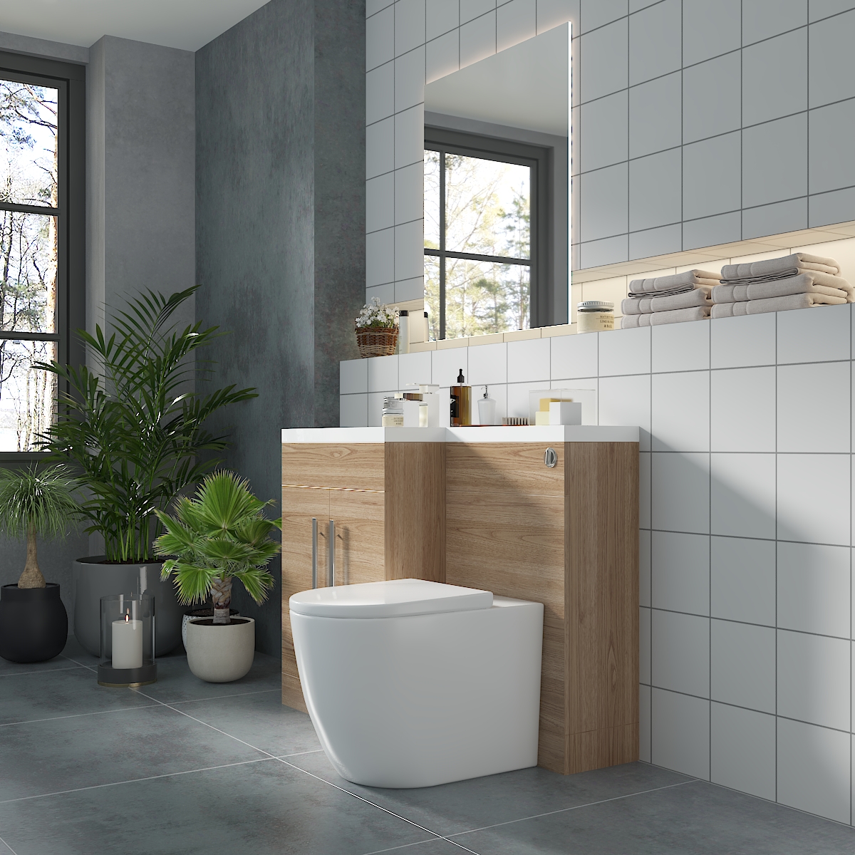 Calm Light Oak Left Hand Combination Vanity Unit Basin L Shape with Back to Wall Cordoba Toilet & Soft Close Seat & Concealed Cistern - 1100mm