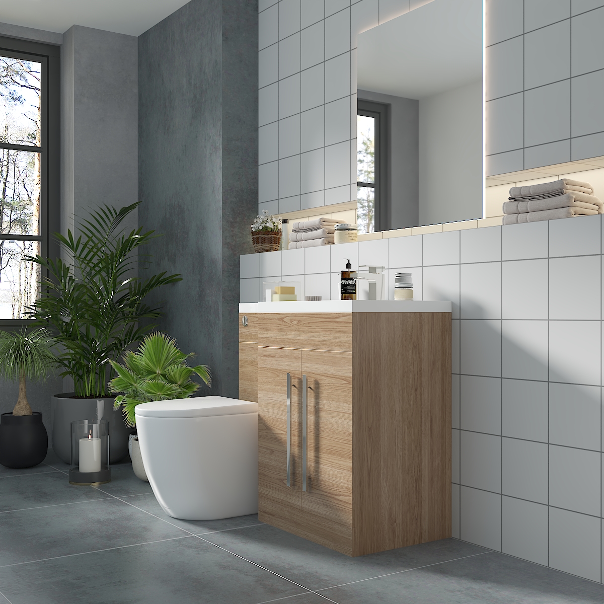 Calm Light Oak Right Hand Combination Vanity Unit Basin L Shape with Back to Wall Cordoba Toilet & Soft Close Seat & Concealed Cistern - 1100mm