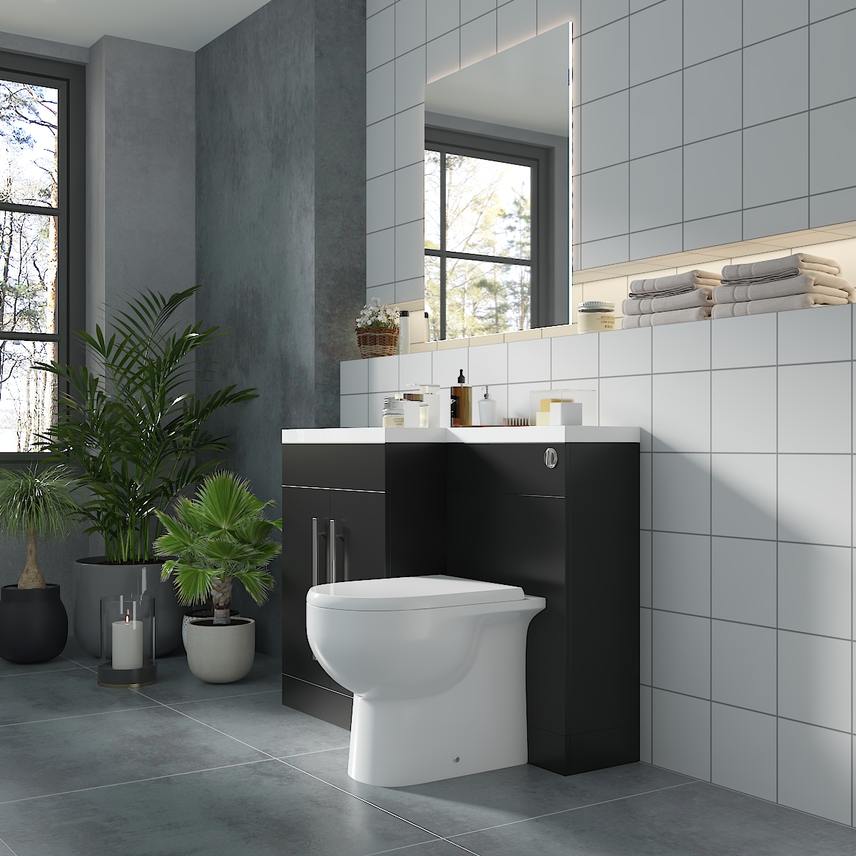 Calm Matt Black Left Hand Combination Vanity Unit Basin L Shape with Back to Wall RAK Tonique Toilet & Soft Close Seat & Concealed Cistern - 1100mm