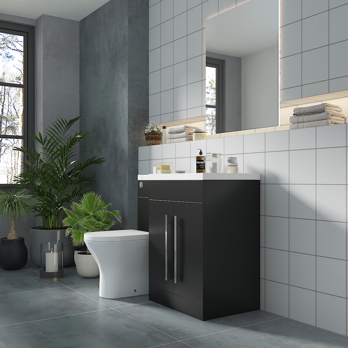 Our vanity unit is designed with convenient handles for easy access and soft-closing doors to keep your bathroom essentials organised. With its sleek basin feature and matching toilet, this design combines two bathroom features into one, providing added functionality and a clean-line look.