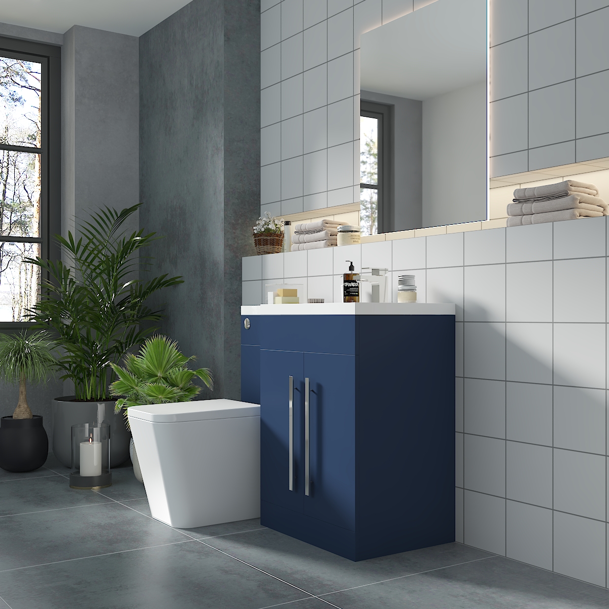 Calm Matt Blue Right Hand Combination Vanity Unit Basin L Shape with Back to Wall Cordoba Square Toilet & Soft Close Seat & Concealed Cistern - 1100mm