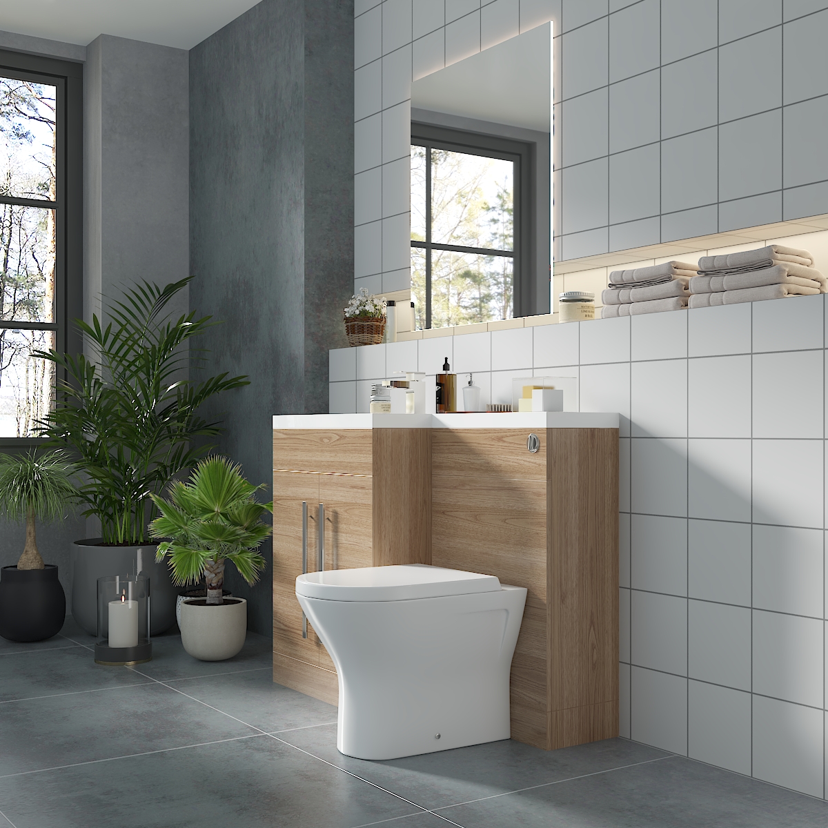 Upgrade your bathroom with our Calm left hand 1100mm combination vanity unit and RAK ceramic toilet. The vanity units minimalist design has a stunning oak finish and white basin that fits into any bathroom. The white RAK resort toilet adds the perfect final touch to fulfill your dream bathroom look.