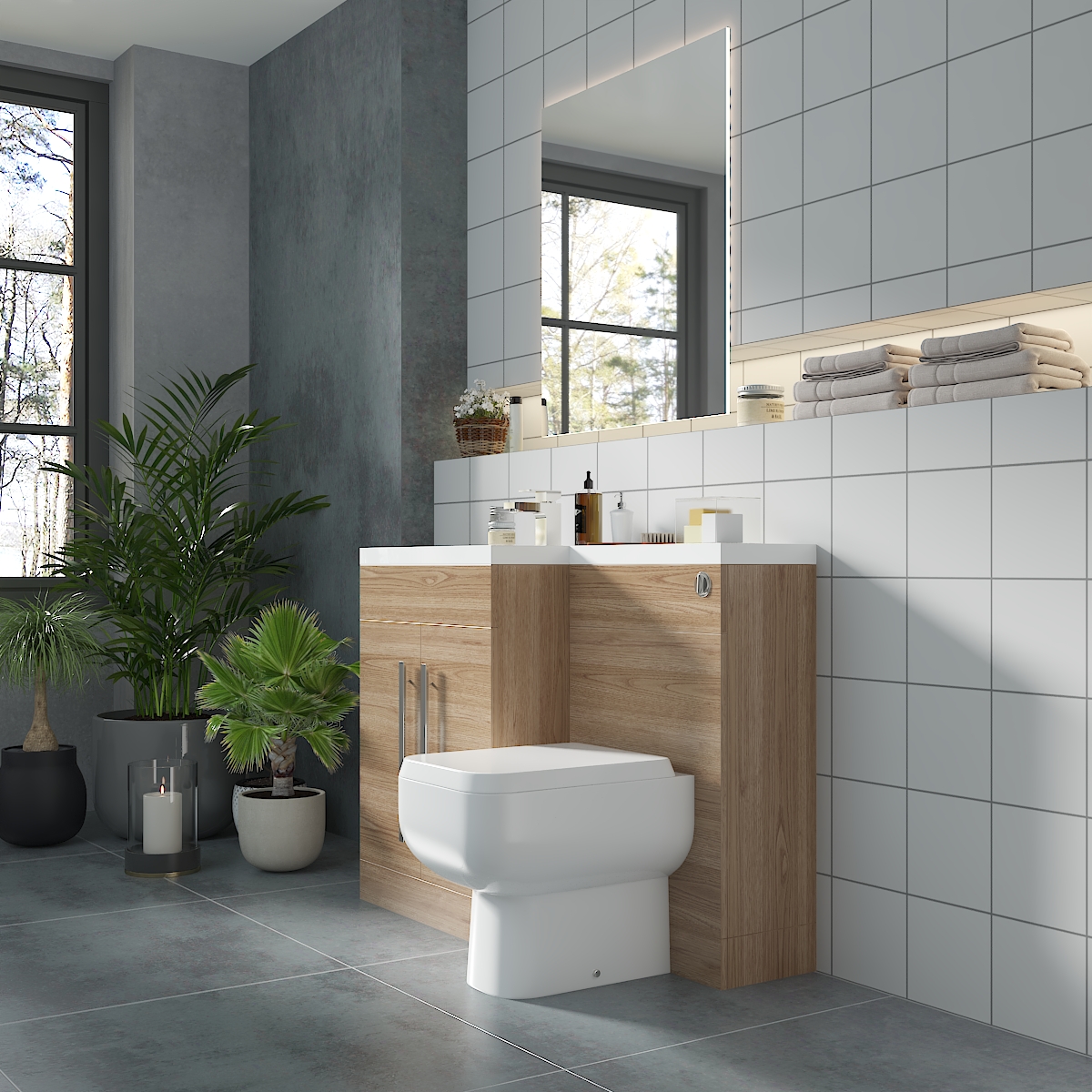 Upgrade your bathroom with our Calm left hand 1100mm combination vanity unit and RAK ceramic toilet. The vanity units minimalist design has a stunning oak finish and white basin that fits into any bathroom. The white RAK series 600 toilet adds the perfect final touch to fulfill your dream bathroom look.