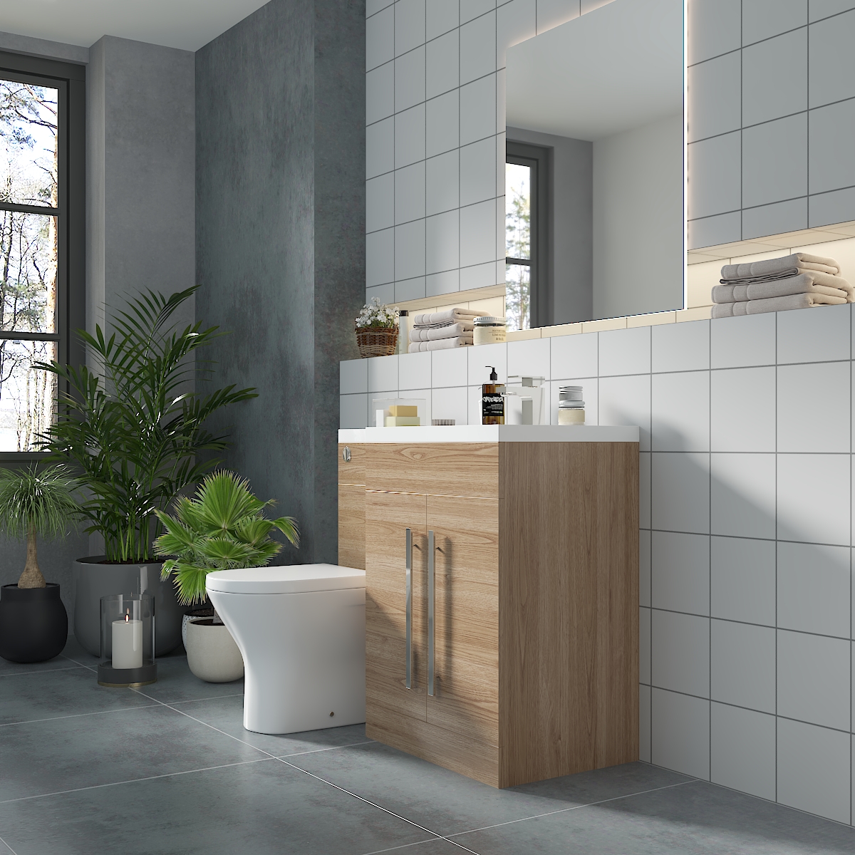 Upgrade your bathroom with our Calm right hand 1100mm combination vanity unit and RAK ceramic toilet. The vanity units minimalist design has a stunning oak finish and white basin that fits into any bathroom. The white RAK resort toilet adds the perfect final touch to fulfill your dream bathroom look.
