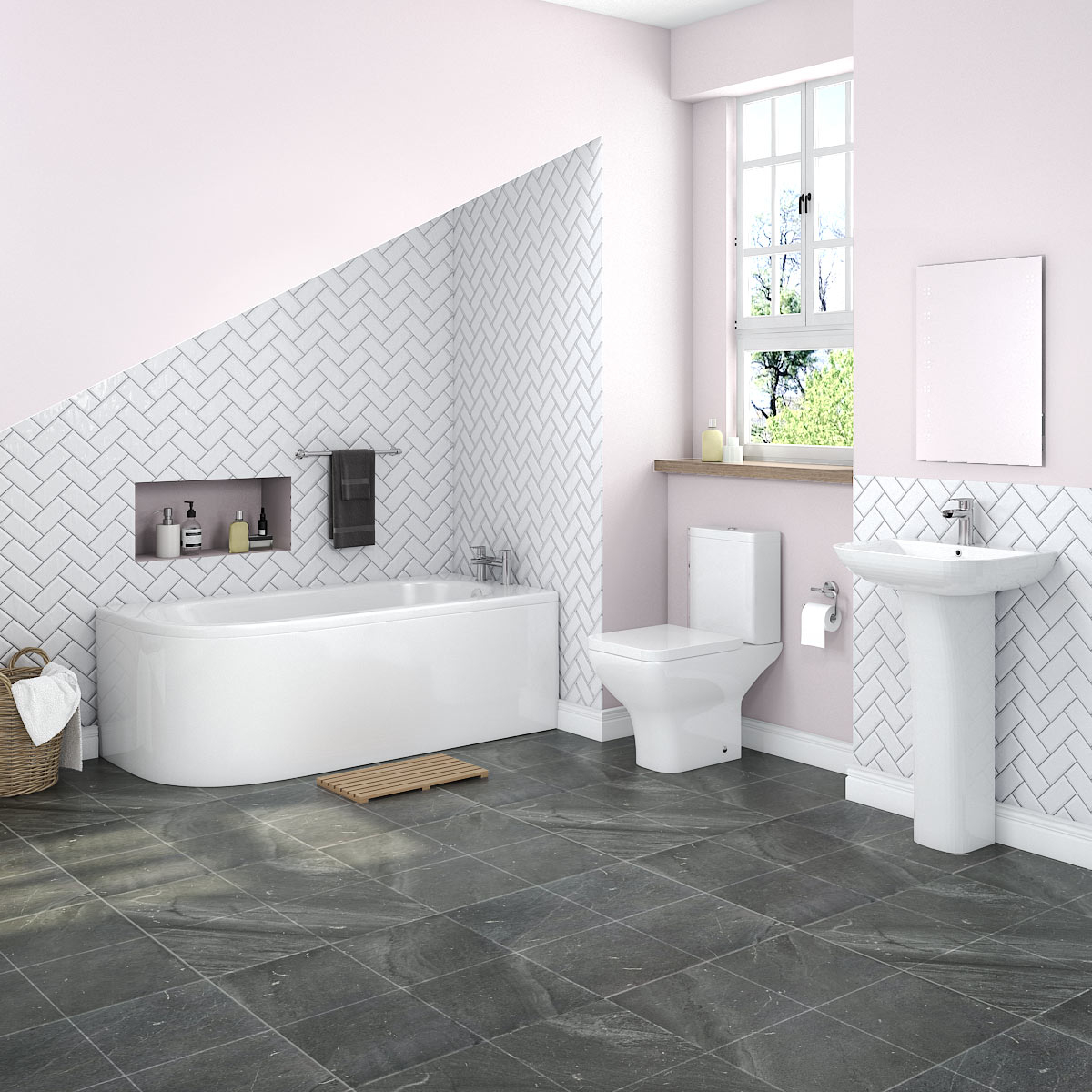 The Feel Curved J shape right hand bath suite is expertly designed to provide maximum functionality and style. Built with family bathrooms in mind, the right hand, J shaped bath is the perfect addition to an average size bathroom, with a 1700x750 size right hand bath. The Feel Curved is a full service bathroom suite, with toilet, bath and pedestal basin included. The bathroom suite also comes with 10 year 'Fit & Forget' guarantee, so you can rest assured that your bathroom suite will last for years to come.