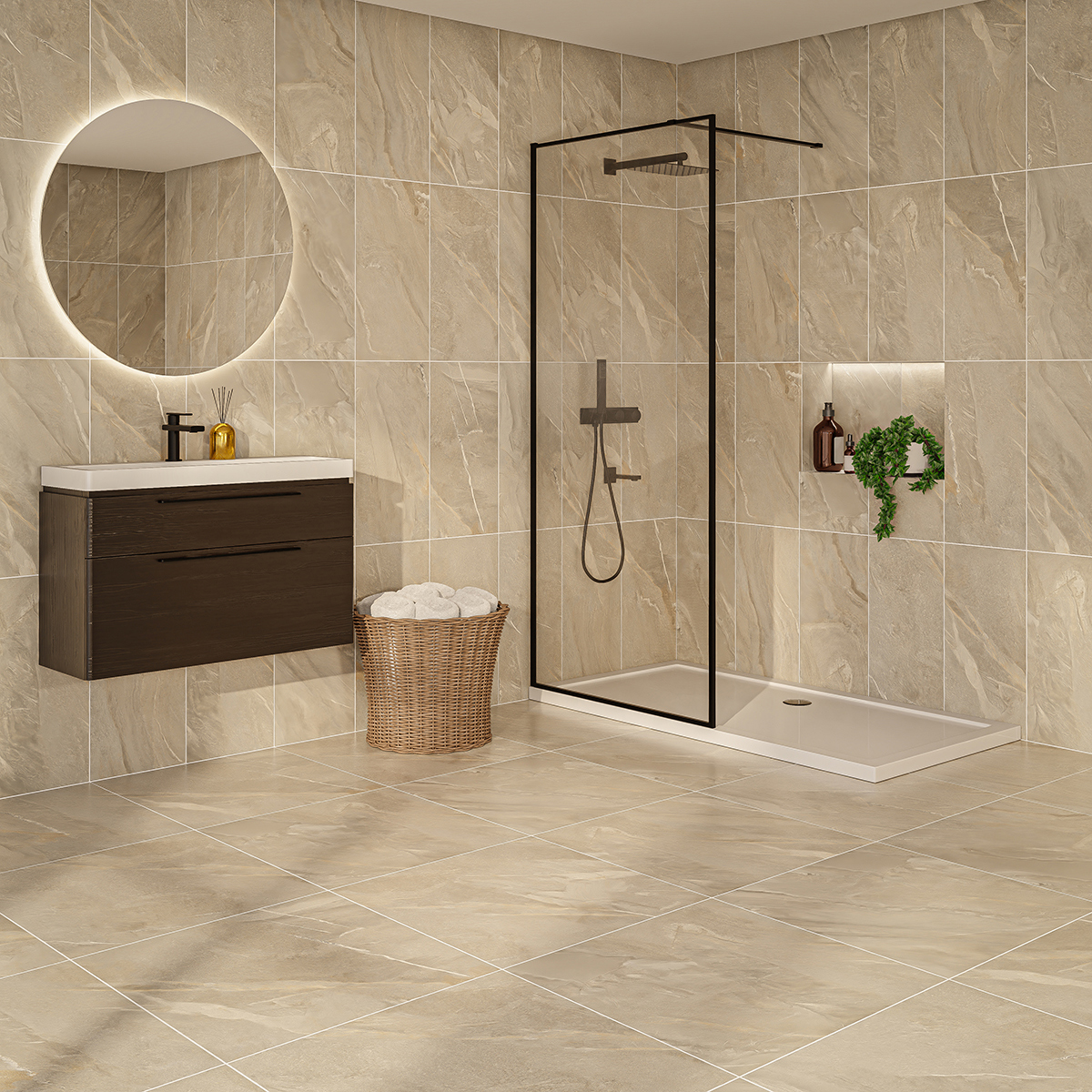 The Granby Beige tile features a genuine replication of real stone with natural, varied veining and warm multi-tonal colouring across a beige palette. Ideal for interior wall and floor designs, this porcelain tile boasts a natural matt finish with a 597x297mm format, 7mm thickness, 24 face variations and rectified edges for a seamless overall look. These tiles have a PTV 36+ rating, suitable for use across wetrooms/bathrooms.