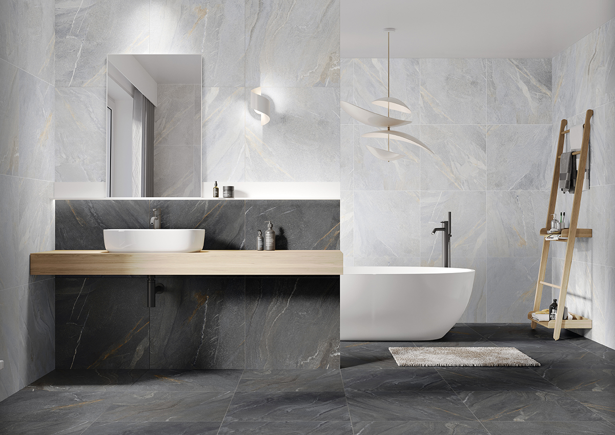 The Granby Grey tile features a realistic stone effect with modern, varied veining and warm multi-tonal colouring across a grey palette. Ideal for interior wall and floor designs, this porcelain tile boasts a natural matt finish with 597x297mm format, 7mm thickness, 24 face variations and rectified edges for a seamless overall look. These tiles have a PTV 36+ rating, suitable for use across wetrooms/bathrooms.