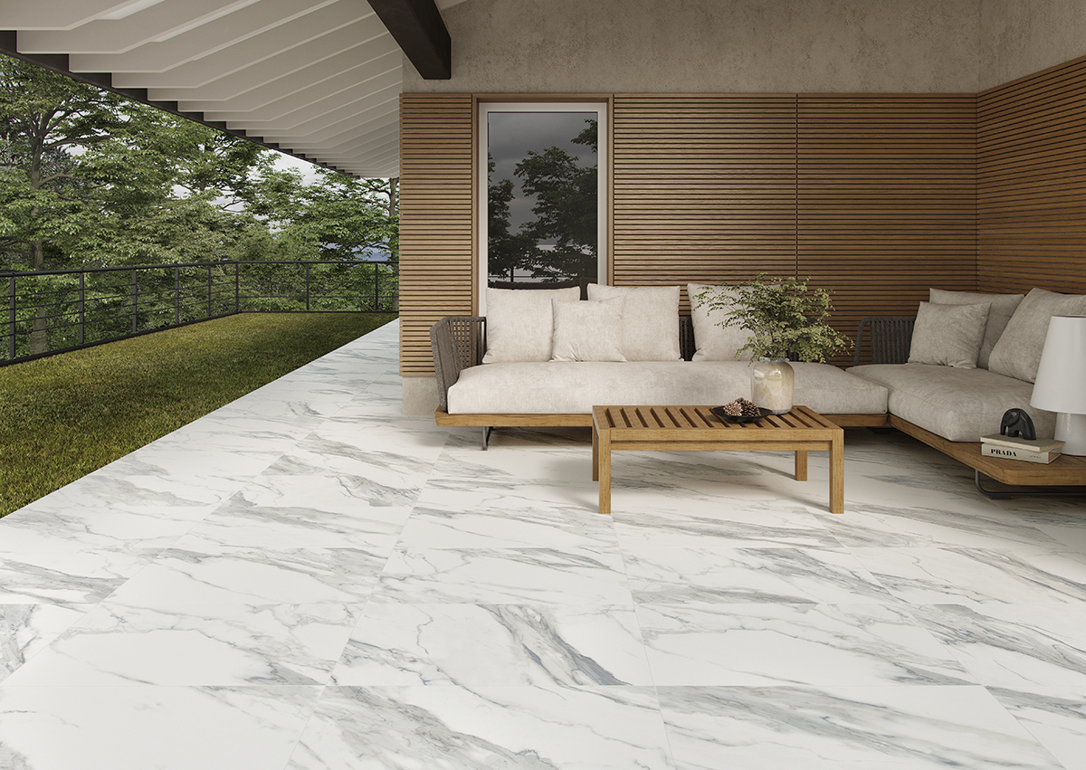 Discover the elegance of the Lancaster tile, a premium porcelain masterpiece featuring a sophisticated white marble effect with a textured matt finish, perfect for enhancing outdoor spaces. Measuring 900x600mm with a sturdy 20mm thickness and R11 anti-slip rating, its rectified edges ensure a seamless, high-end look for any exterior desig