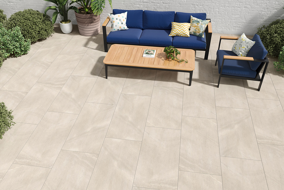 Discover New Pietra outdoor slab, where realistic stone effect with gentle, neutral beige veins and hues come to life in a durable porcelain construction. Perfect for creating sophisticated exterior floors, this large 1200x600mm slab features a matt finish, 20mm thickness and rectified edges for a seamless beauty, enhanced further by their 3 face designs
