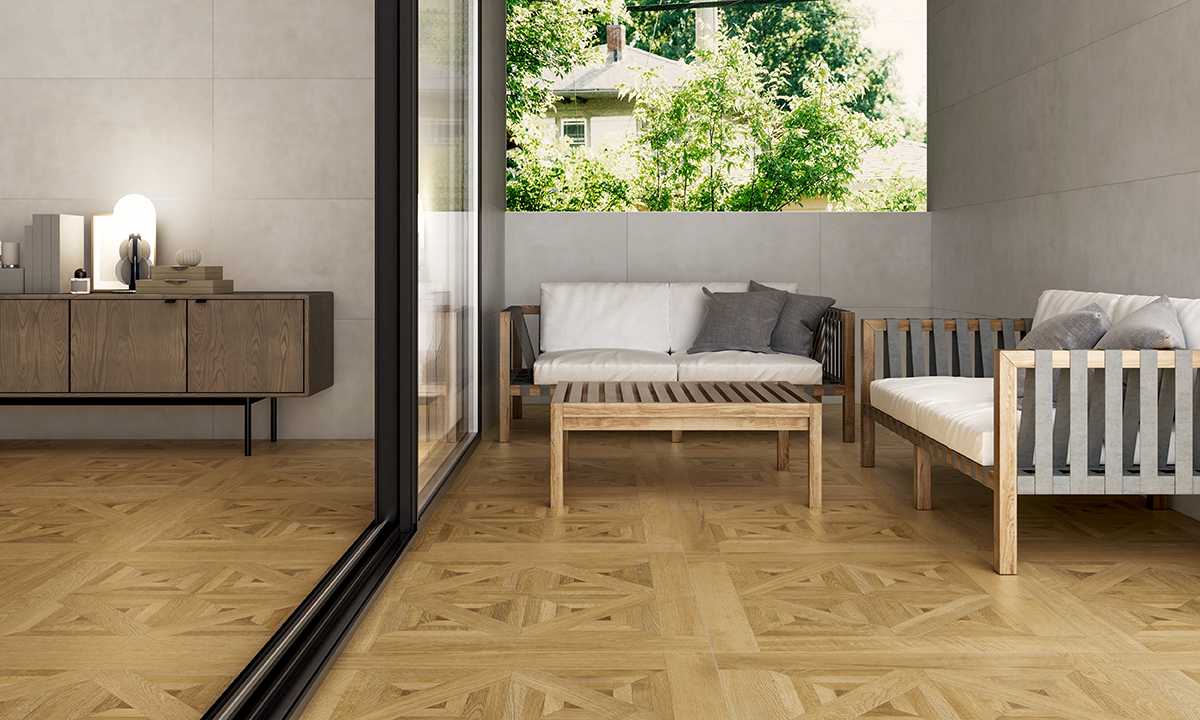 The Old Manor Paving Slab offers a durable, porcelain solution for exterior floors featuring a parquet wood effect in oak brown. Its 900x900mm size, natural matt finish, rectified edges and seven face variations make it a practical and visually appealing choice.