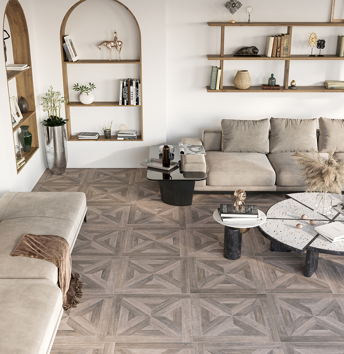 Elevate any space with Pavilion Noce Wood, a standout parquet wood-effect tile with realistic knots and a sophisticated cool brown hue. Crafted from durable glazed porcelain with a matt finish, this 600x600mm tile is a versatile option for both walls and floors.