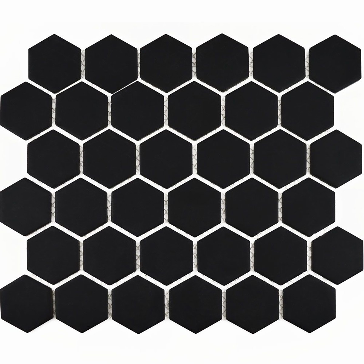 These Pixel Black Hexagon 50X50 matt Tiles have a stylish design in a matt finish. They're made from porcelain and measure 321x278x5mm. R11 and PTV 36+ rated, suitable for use across wetrooms and exterior designs