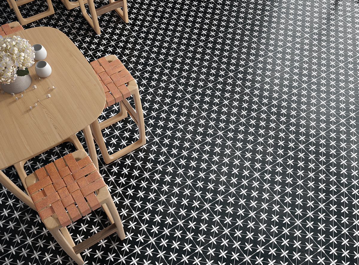 Create a refined, modern style with the Poole Black tiles, a monochrome patterned design across a classy, matt surface. These square 450x450mm tiles feature an R10 slip resistance and strong ceramic build, making them perfect for both interior walls and floors for an injection of character.
