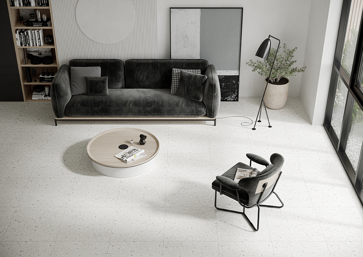 Discover the charm of Meet Me, a speckled porcelain tile with a realistic terrazzo stone effect, featuring light grey hues and distinct chunks that bring a unique character to any space. Its matt finish, rectified edges and 598x598mm square format with 8mm thickness make it a versatile choice for both interior walls and floors.