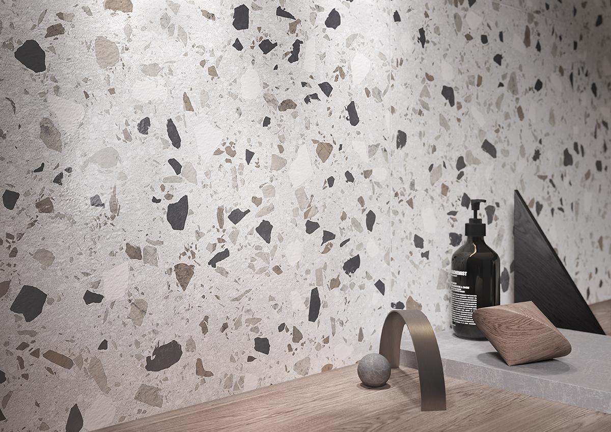 Discover the charm of Twister, a speckled porcelain tile with a realistic terrazzo stone effect, featuring grey hues and distinct chunks that bring a unique character to any space. Its matt finish, rectified edges and 598x598mm square format with 8mm thickness make it a versatile choice for both interior walls and floors.